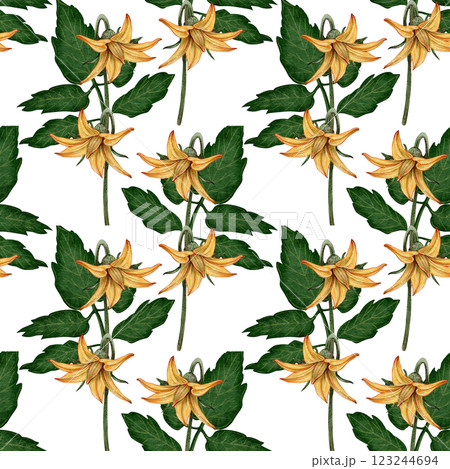 Seamless pattern of watercolor garden flowers on a white background. Daisies, clematis flowers and small garden greens. For packaging, fabrics and wallpapers in a Victorian, floral style.