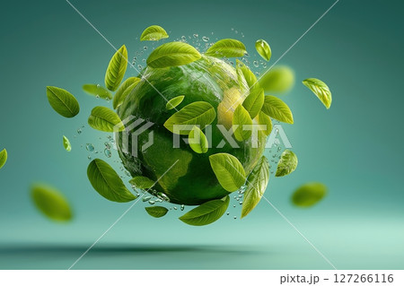 Stylized Earth Globe Surrounded By Floating Green Leaves Against Soft Teal Background