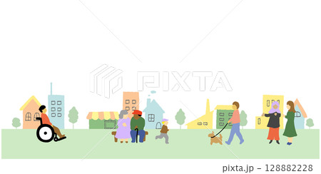 いろいろな人々がいる街並みのかわいい手描きイラスト