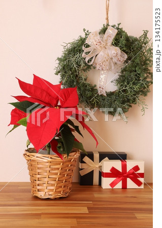 Christmas seamless pattern with evergreen plants, mistletoe, holly berry and candy cane with red bow, pink gift box, berries on branch and poinsettia flowers. Repeated illustration for wrapping paper