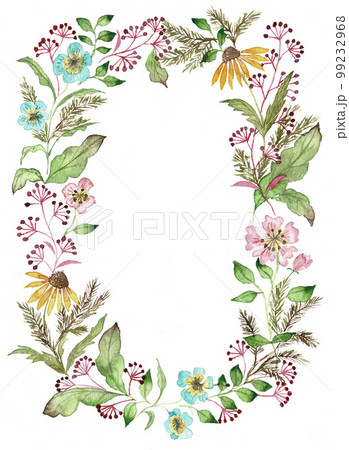 Watercolor floral border. Flower pink rose, green leaves. Wedding concept with flowers. Floral poster, invite. Spring wildflower arrangements