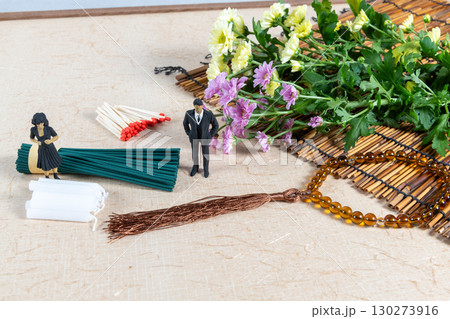 お墓参り用の持ち物と喪服姿の小さな人形