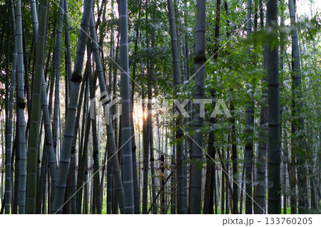 Sunlight gently pierces through tall bamboo stalks in a lush forest, enveloping the scene in a warm, golden glow. The tranquil setting invites a sense of peace and connection to nature.