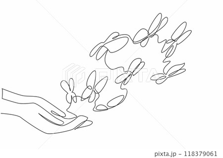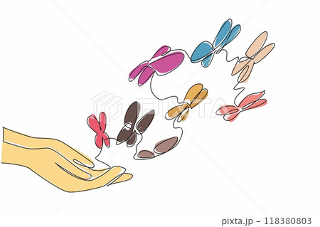 Single one line drawing two open hands releasing a multitude of butterflies. Preserving the beautiful arthropods. National Learn About Butterflies Day. Continuous line design graphic illustration