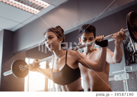 Asian personal trainer coaching a bodybuilding woman to perform the dead lifting exercise with barbell in the fitness gym.