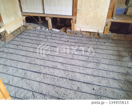 砕石の上にワイヤーメッシュの敷き込み 格子状