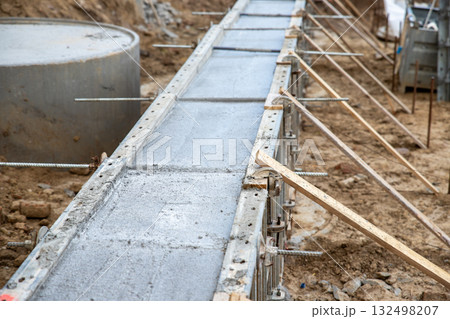 Concrete foundation poured into metal formwork at construction site. Steel rods, braces and rebar elements create strong structure supported by soil and wooden beams