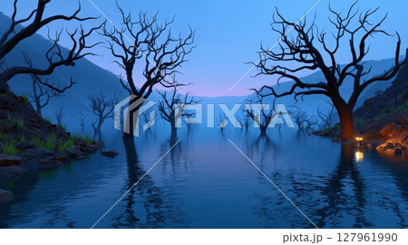 An eerie swamp illuminated by a single lantern evokes a sense of mystery, with bare trees and water reflecting the twilight sky