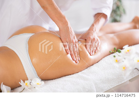 Female masseur performs stroking during spa procedure of thigh area for girl, close up