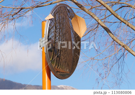カーブミラーに映る冬のメタセコイア並木 滋賀県高島市マキノ町
