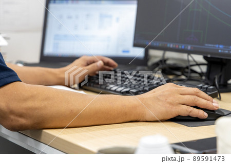 パソコンでCAD図面を制作する設計者の手とデスク