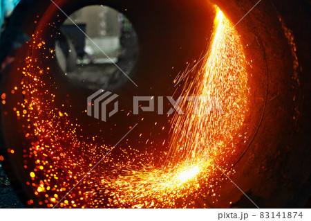 Cut a metal pipe of large diameter and sparks fly. Industrial background.