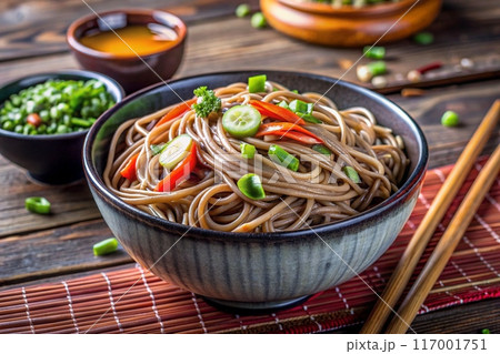 Soba noodles with mixed vegetables in ceramic bowl on wooden background. Ai generated