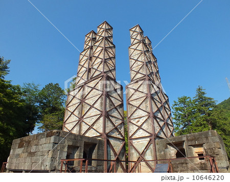 静岡県観光スポット・韮山反射炉下部は伊豆石の組積、西方向から北A炉B炉の煙突・青空バック縦位置
