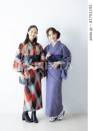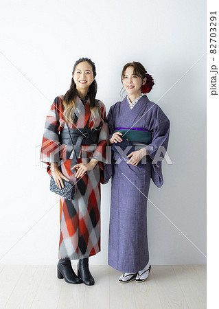 カジュアルな着物の女性2人