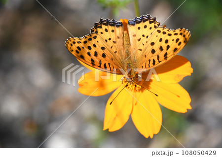 キバナコスモスから吸蜜するツマグロヒョウモンの♂