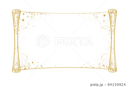 Beautiful vintage golden scroll with stars, space for text. Antique sheet of paper, line drawing, blank for astrology, esotericism, fortune telling, mystical design. Vector illustration isolated.