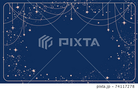 Blue magic background with stars and space decor with copy space. Layout for astrology, tarot, prediction. Divine boho design, hand drawn vector illustration, vintage style.