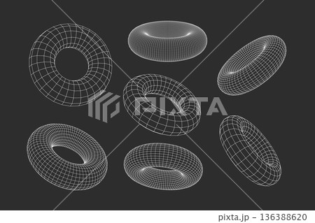 Abstract 3D torus geometry wireframe set. Blue and white vector grid rings on dark background. Mathematical mesh shapes for futuristic tech design, science and digital projects.