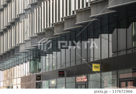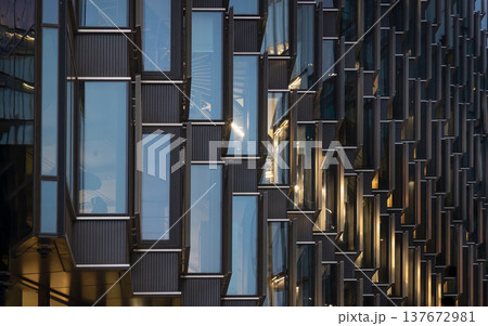 The large glass surfaces of the building ground floor act as mirrors, capturing and repeating the complex, rhythmic patterns of the overhead architectural fins to create a stunning, layered visual