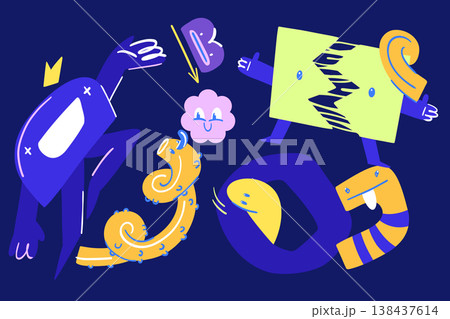 Geometric characters on dark blue, a torn rectangle, a spring slime, a in a dynamic composition