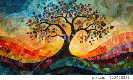 Twisted tree forms with quilt inspired patterns emerge from the darkness, a blend of nature and abstract art. Vibrant abstract quilted tapestry artwork intricate patterns and gradian