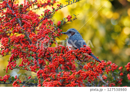 ナナカマドの枝に止まり実を食べるヒヨドリ