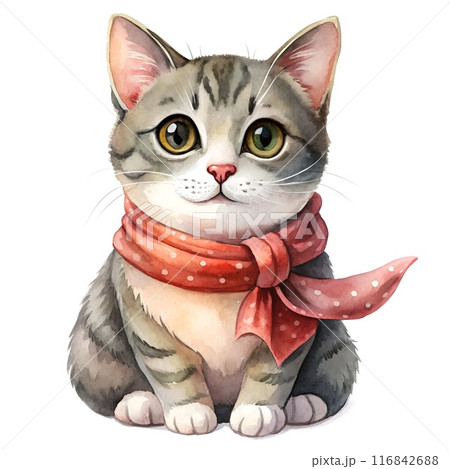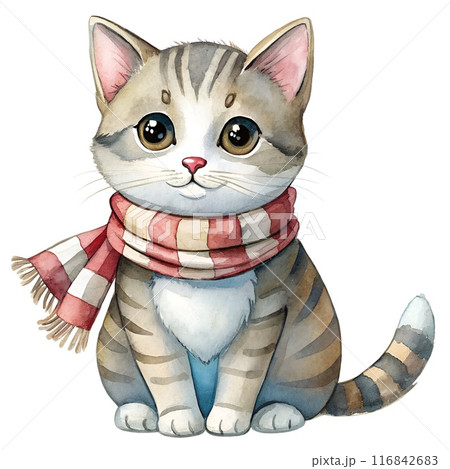 Watercolor painting, cartoon style, of American Short Hair cat wear a scarf, generative ai