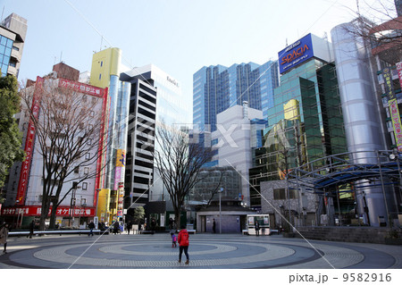日本の東京都市景観 新風景。池袋駅前の池袋西口公園・東京芸術劇場やガラス窓に映る超高層ビルなどを望む