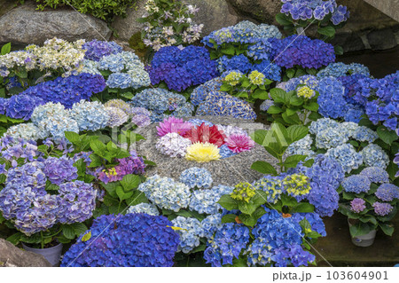 龍蓋寺(岡寺)華の池 水面に浮かぶ紫陽花--奈良県高市郡明日香村岡--