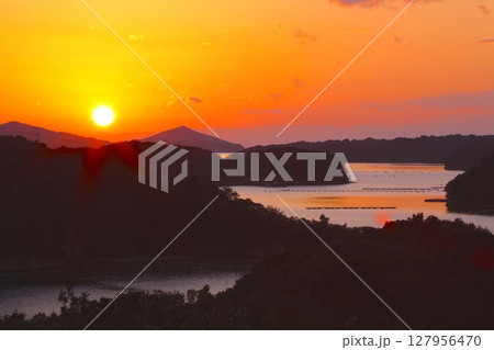 伊勢志摩、西山慕情ヶ丘より夕陽とリアス式海岸に広がる真珠の養殖筏群を展望