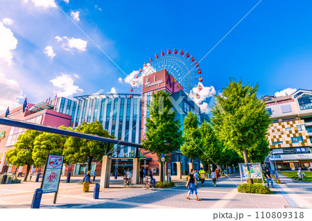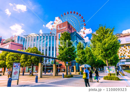 日本の横浜都市景観 センター北駅前・青空に映える観覧車や都築阪急などを望む=令和5年8月11日