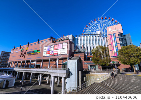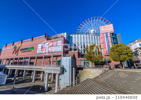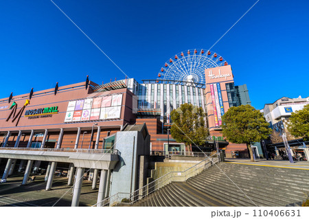 日本の横浜都市景観 1月。センター北駅前・青空に映える観覧車や都築阪急などを望む=令和6年1月9日