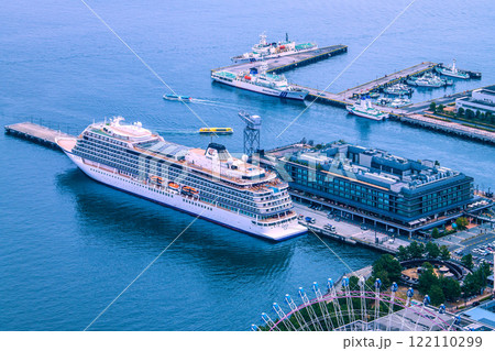 日本の横浜都市景観 初入港。新港ふ頭客船ターミナルのバイキング・エデンなどを望む=19日