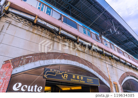 日本の東京都市景観 10月。新橋駅 日比谷口や電車などを望む。希望の光…=27日