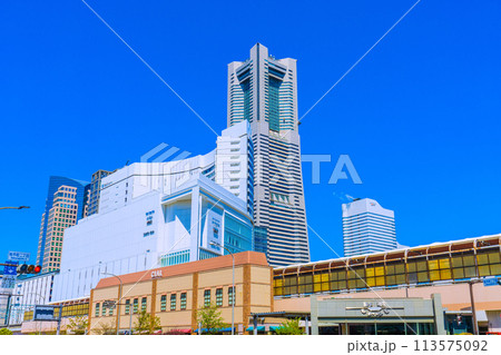 日本の横浜都市景観 横浜の街。桜木町駅前の横浜ランドマークタワーやアニヴェルセルなどを望む