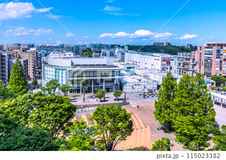 日本の横浜都市景観 センター北駅前やセンター南駅(画面左奥)などを望む