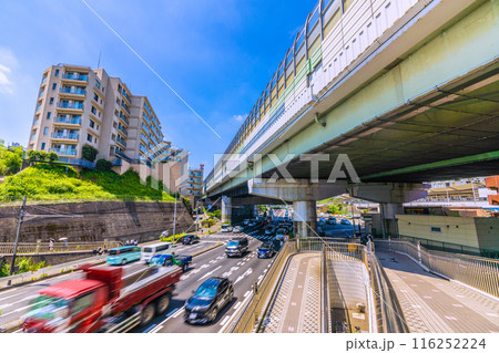 日本の横浜都市景観 7月。「江田駅東」の交差点や国道246号、東急江田駅前ドエリングなどを望む=4日