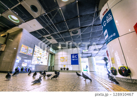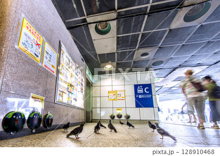 日本の東京都市景観 鳩被害対策グッズ…新宿駅西口の地下・タクシーロータリー前はハトの休憩場…