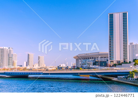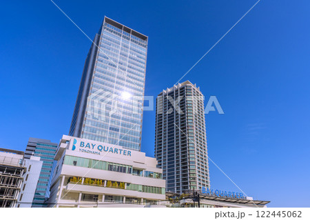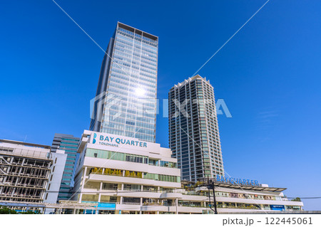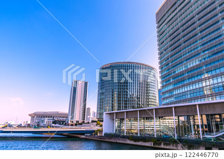 日本の横浜都市景観 みなとみらいのKアリーナやヒルトン横浜、新高島駅周辺などを望む=13日