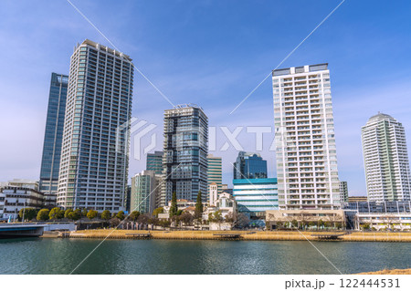 日本の横浜都市景観 みなとみらいのKアリーナや新高島駅周辺、タワーマンション群などを望む=13日