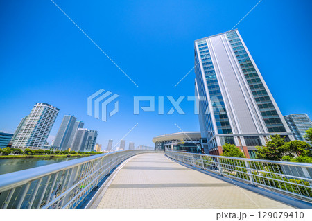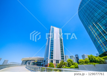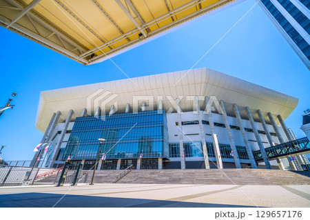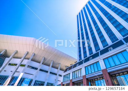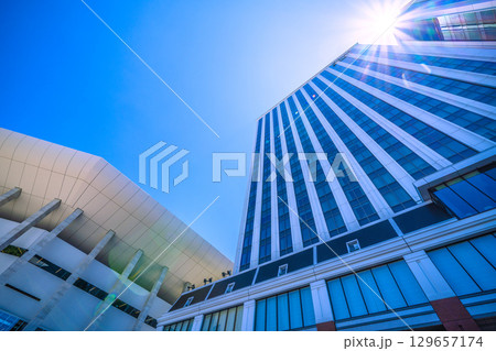 日本の横浜都市景観 みなとみらいのKアリーナと隣接するヒルトン横浜などを望む