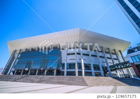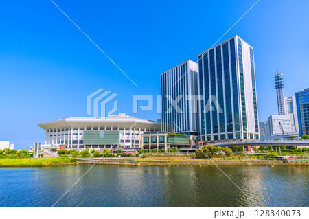 日本の横浜都市景観 みなとみらいのKアリーナと隣接するヒルトン横浜(右)などを望む