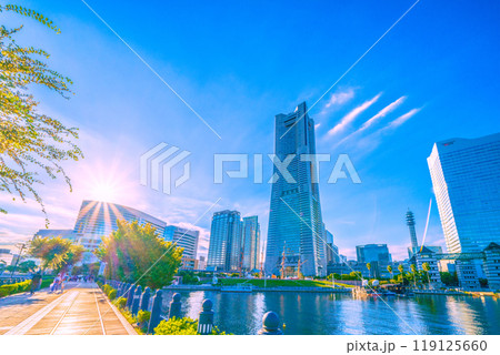 日本の横浜都市景観 太陽光を浴びるYOKOHAMA AIR CABIN桜木町駅などを望む。希望の光