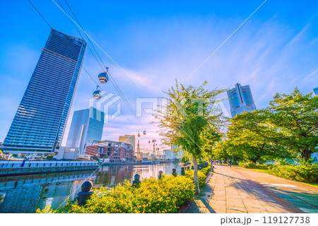 日本の横浜都市景観 YOKOHAMA AIR CABIN運河パーク駅などを望む