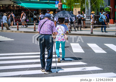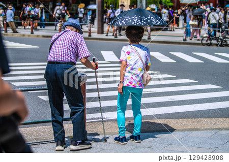 日本の東京都市景観 高齢化社会…杖の高齢者…=8日、都内(浅草寺・雷門前の交差点で)