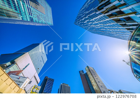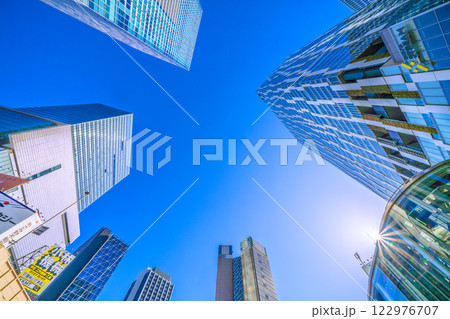 日本の東京都市景観 新景色。太陽光を反射する渋谷のビル群。アクシュ(誕生)やヒカリエ、ストリーム…