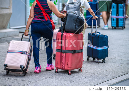 日本の東京都市景観XEC株…インバウンド続く…吾妻橋交差点近くにもスーツケースの観光客…右奥は浅草寺