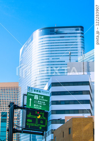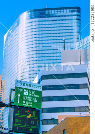 日本の東京都市景観 汐留などのビル群や首都高・300m入口18汐留の標識などを望む=令和7年1月