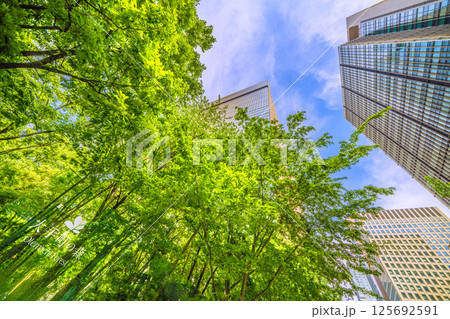 日本の東京都市景観 大手町の森や大手町タワーなどを望む